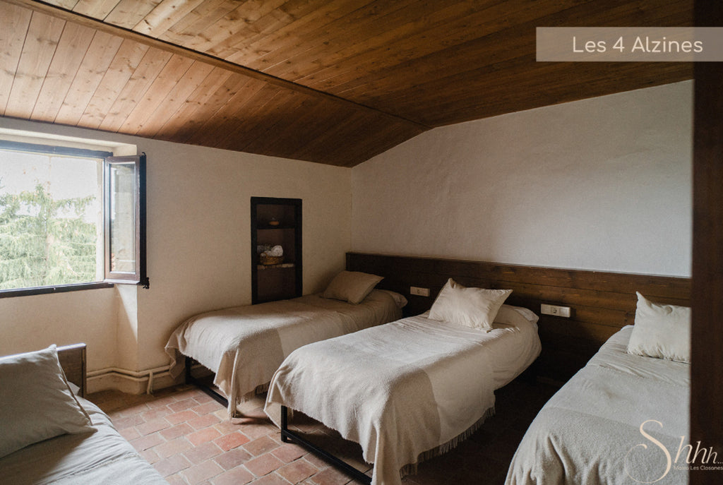 Habitación luminosa y acogedora, equipada con 4 camas individuales, perfecta para quienes desean vivir la experiencia del retiro compartiendo con otras personas, pero manteniendo su propio espacio de descanso.